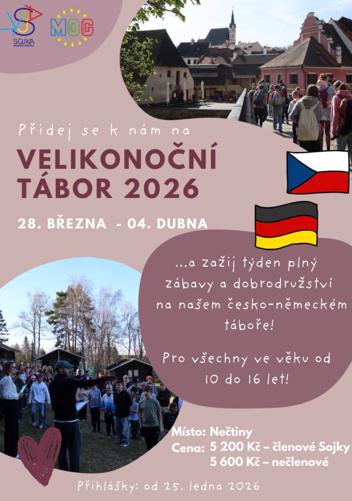 Jako každý rok se společně potkáme na velikonočním táboře – čeká nás týden plný zábavy se Sojkou a MOGem! Zveme vás na česko-německý velikonoční tábor OLA, který proběhne od soboty 28. března do soboty 4. dubna v areálu Zámek Nečtiny. Tábor je určen pro všechny ve věku 10 až 16 let, kteří chtějí zažít super program, poznat nové kamarády a užít si Velikonoce trochu jinak než doma.