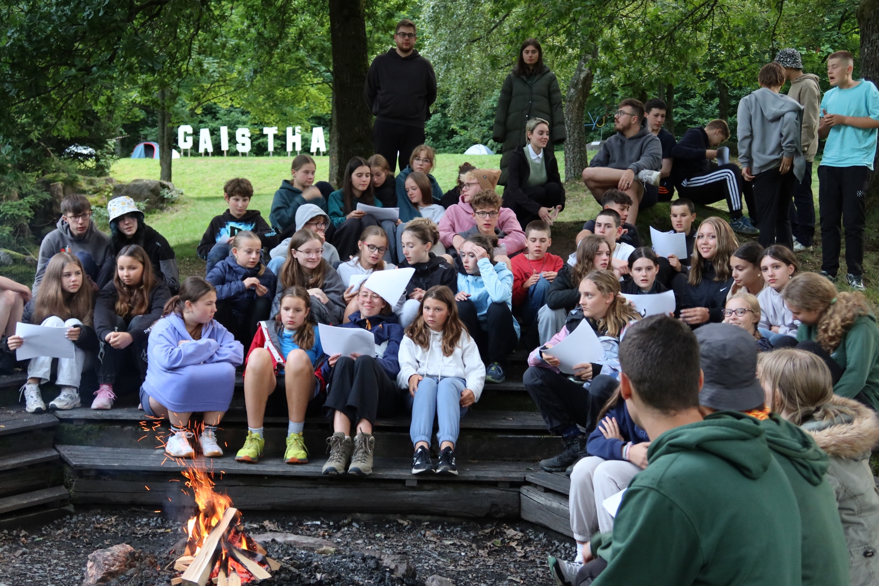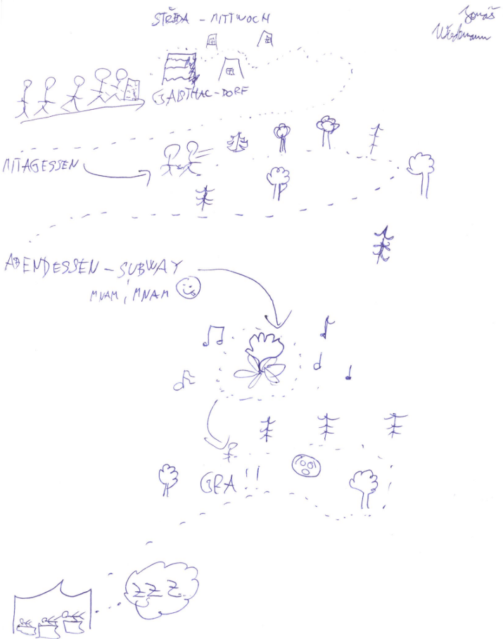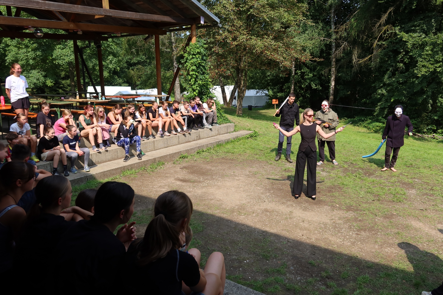 Nach einem leckeren Abendessen im Subway-Stil wollten wir uns schließlich beim Lagerfeuer etwas erholen. Dort begegneten wir erneut der Waffenhändlerin – nach der Erfahrung des Tages entschieden wir uns jedoch für einen Friedensschluss und verbrachten den Abend gemeinsam beim Singen. Die abendliche Feier war gerade vorbei, als wir einen Hinweis von der Polizei bekamen: Die Falschgeld-Chefin solle sich angeblich in der Nähe des Lagers aufhalten. Also machten wir uns auf zu einem gruseligen Nachtspaziergang – und wurden am Ende Zeugen ihrer Festnahme. Doch die Festnahme verlief seltsam – fast so, als ob die beiden Hauptpolizisten sie gar nicht wirklich verhaften wollten…