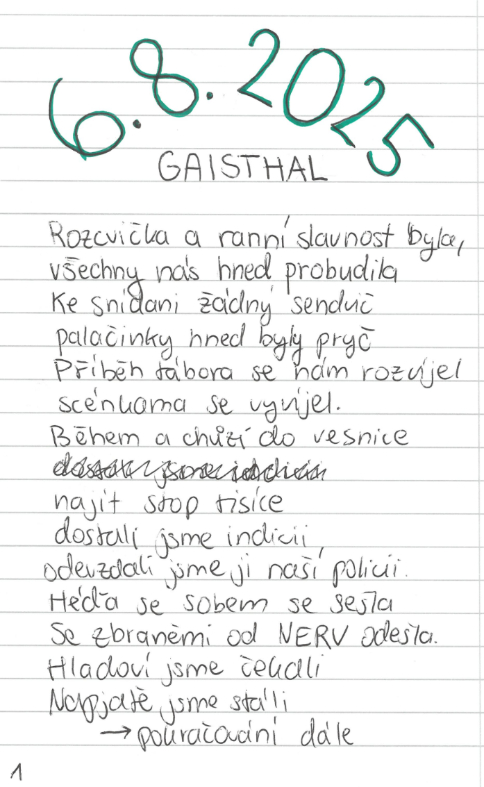 Včerejší podivný dopis nám nedal spát. Hned dopoledne jsme se proto vydali prozkoumat vedlejší vesnici, kde se nám podařilo sehnat jednotlivé dílky fotografie, která nám odhalila identitu hlavní new gaisthalské dodavatelky zbraní. Zároveň jsme krátce na to byli svědky tajného obchodu se zbraněmi, kde jsme na vlastní oči viděli dodávku zbraní pod značkou organizace Nerv. Došlo nám, že se jedná o stejnou organizaci, které jsme včera věnovali celý výtěžek z našeho obchodování. Hned odpoledne jsme se rozhodli šéfku zbraňového kartelu konfrontovat s našimi zjištěními. Netušili jsme však, s kým máme tu čest – dodavatelka zbraní byla sama ozbrojena, a navíc v doprovodu svého komanda, které se nás pokusilo napadnout a umlčet. Zároveň nám potvrdila naše domněnky – včera jsme opravdu v obálce našli padělané peníze, které jsme v nevědomosti pomohli dostat do oběhu. Radši jsme proto utekli ve dvojicích z tábora, abychom se vyhnuli možnému útlaku a nebezpečí.
